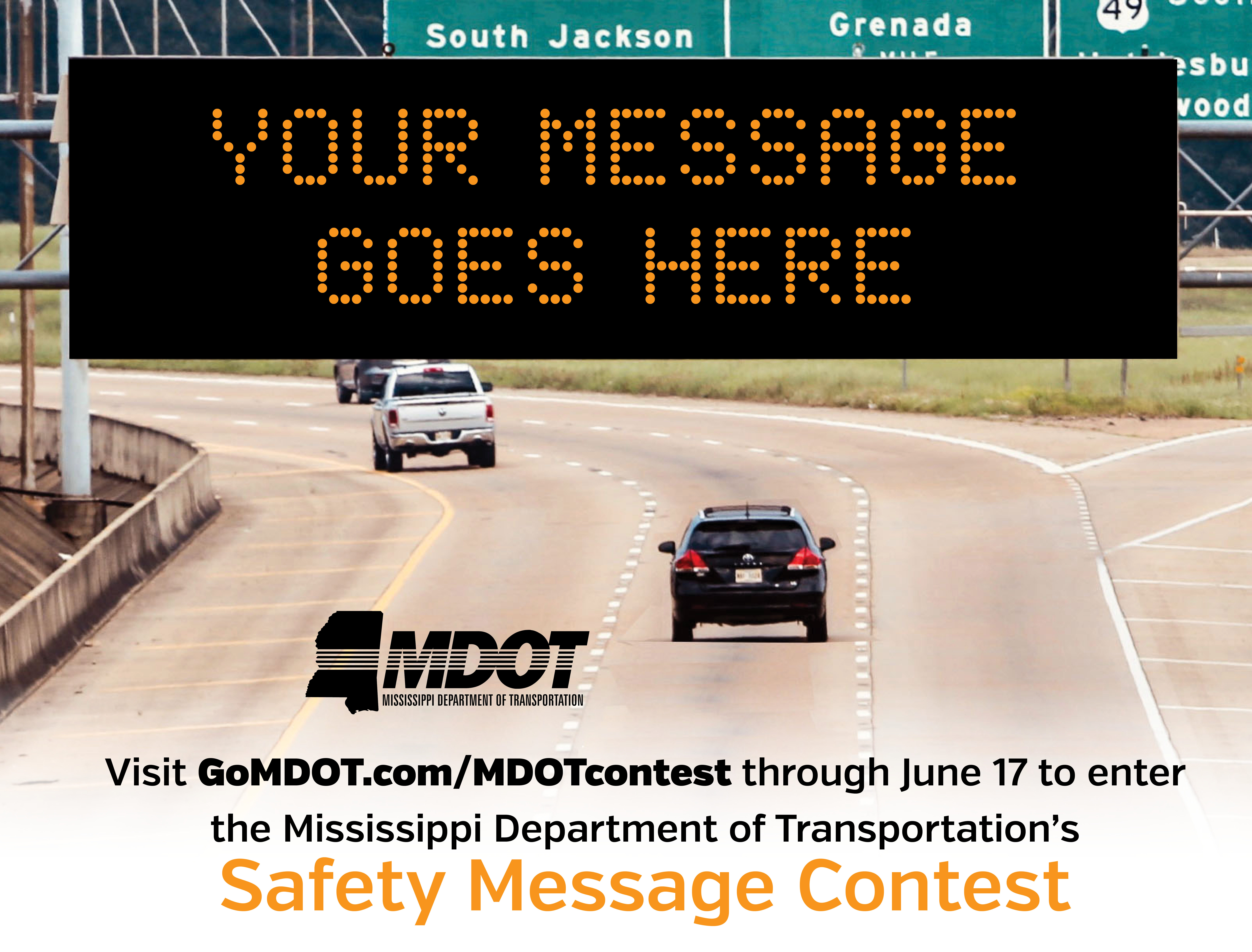 After entries have been submitted, MDOT will select the top five messages, and each will be displayed on overhead signs along Mississippi highways. The winning messages will also be posted on MDOT social media.