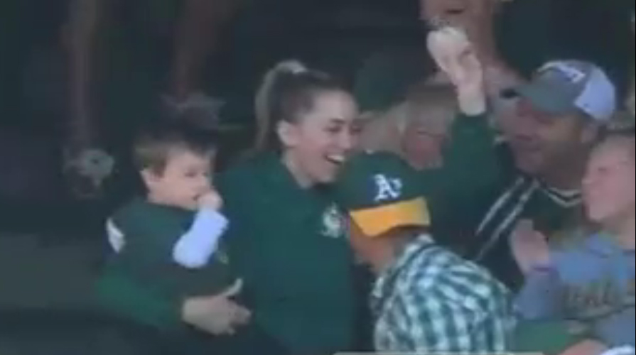 An Oakland A’s fan named Michelle was at the Father’s Day game when she snagged the foul ball … while holding her young son!