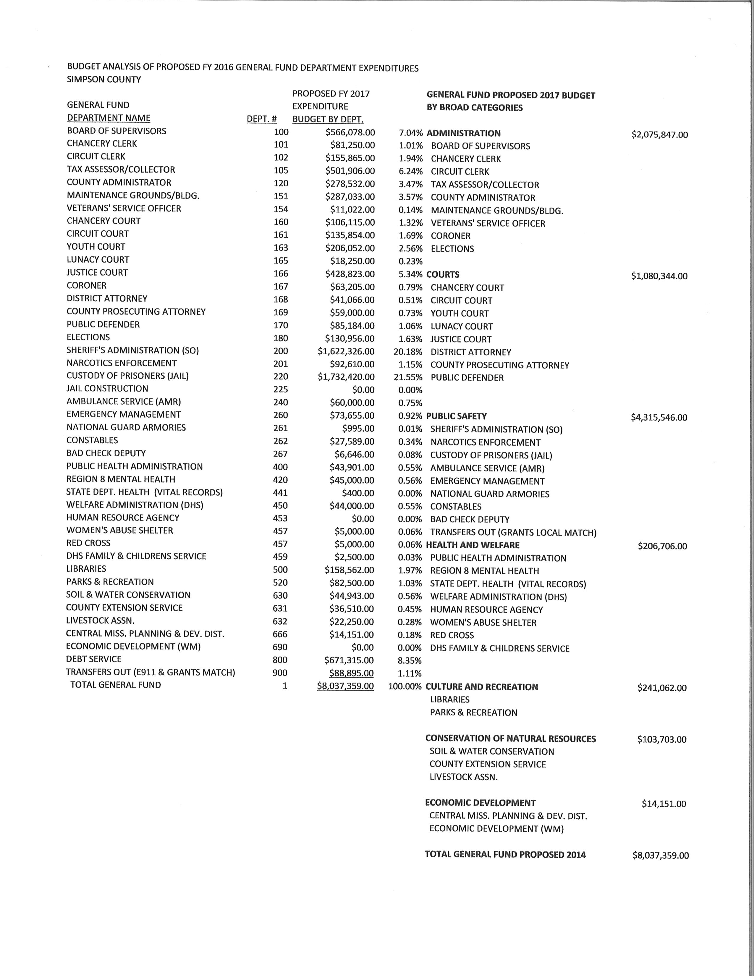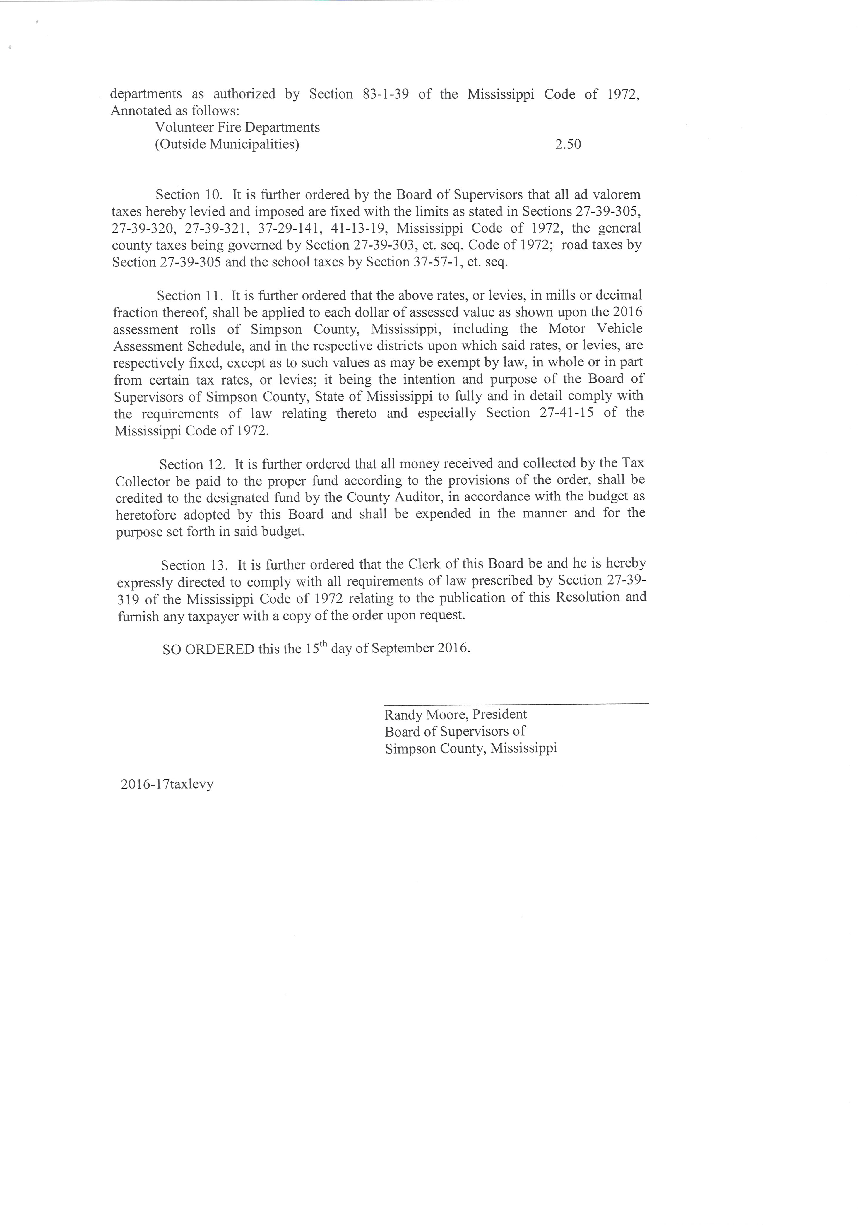The Simpson County Board of Supervisors held a public hearing on its proposed ad valorem tax revenue increase for fiscal year 2017 and on its proposed budget and proposed tax levies for fiscal year 2017 on Thursday, September 15, 2016 at 9:00 a.m. in the Board Room of the Simpson County Chancery Court Building, 111 West Pine Avenue, Mendenhall, Mississippi.