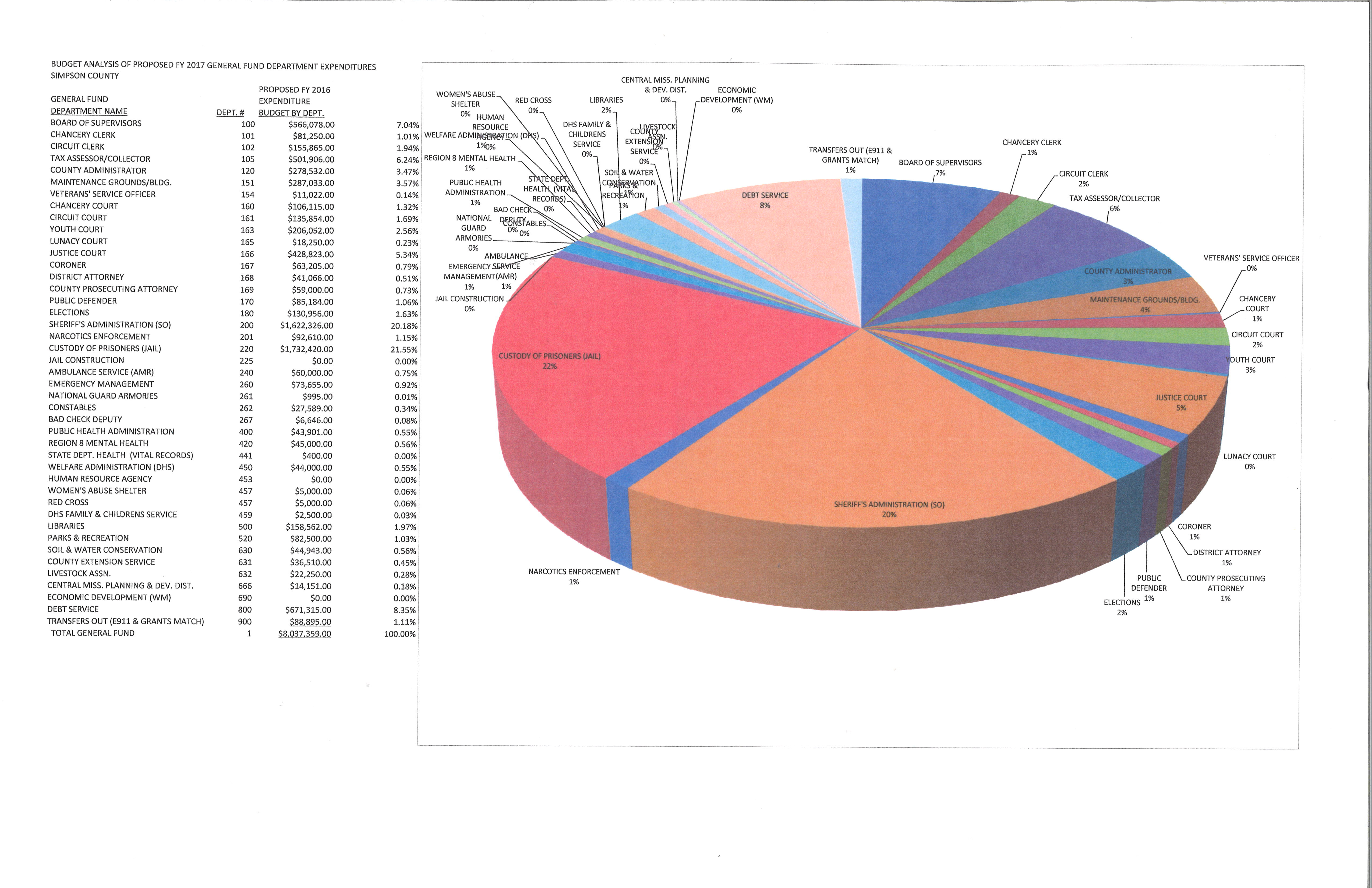 The Simpson County Board of Supervisors is now operating with projected total budget revenue of $15,361,674.Β (59.70%) or $9,171,576, of such revenue is obtained through ad valorem taxes. For next fiscal year, the proposed budget has total projected revenue of $15,765,272. Of that amount, (61.54%) or $9,701,496, is proposed to be financed through a total ad valorem tax levy.