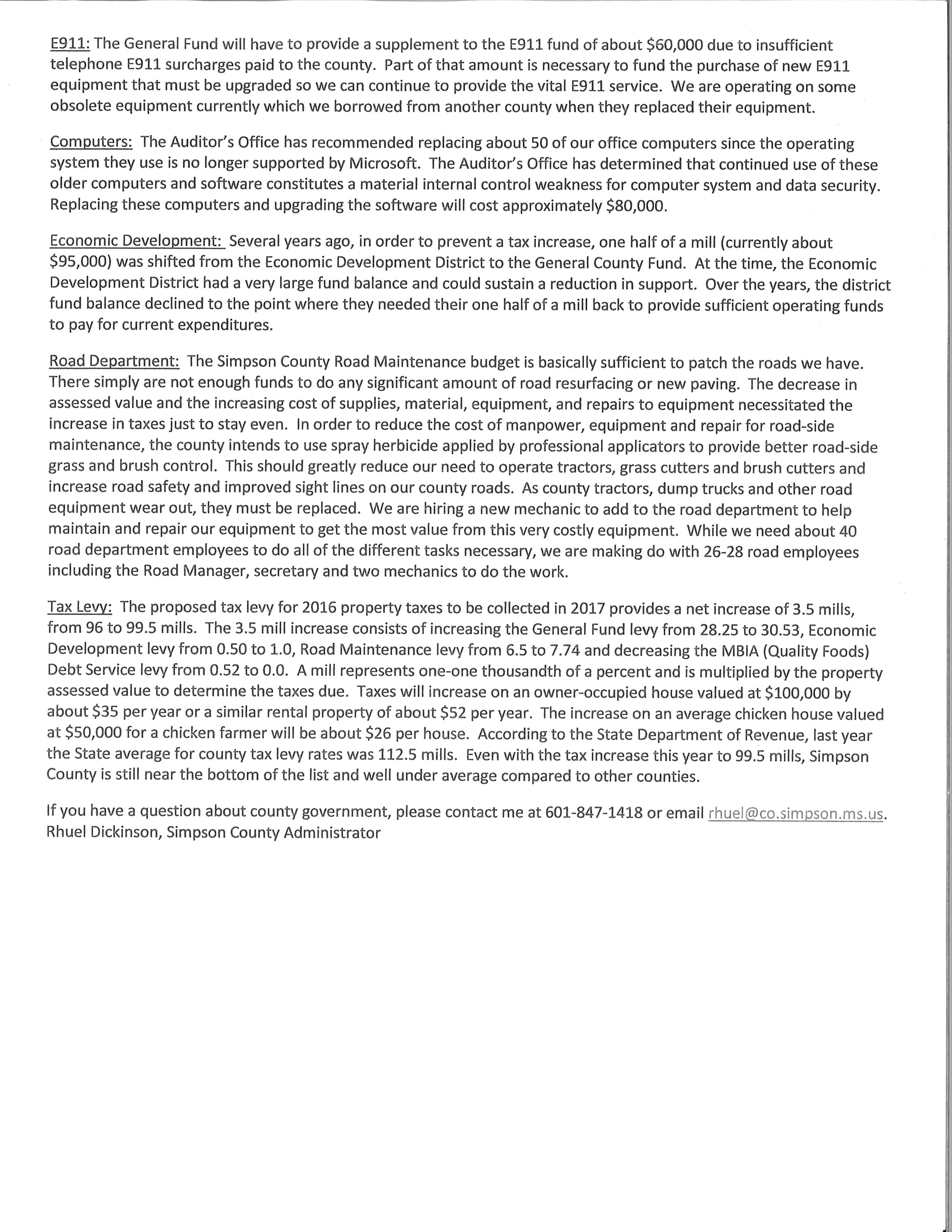 For the next fiscal year 2017, Simpson County plans to increase your ad valorem tax millage rate by 3.5 mills from 96 mills to 99.5 mills. This increase means you will pay more in ad valorem taxes on your home, automobile tag, utilities, business fixtures and equipment and rental real property.
